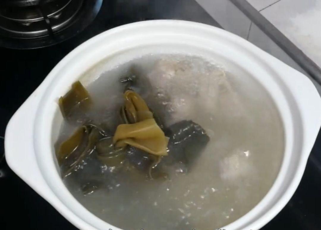 5.10分钟后可以看到排骨里面的油已经炖出来了,这时下入海带结,盖上盖子用小火慢炖20分钟,排骨中的油炖出来,这道汤的味道才会更加香醇。