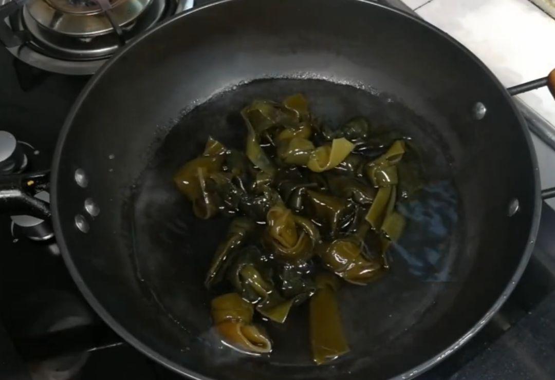 3.重新换锅加水,下入海带煮一下,水开后再煮2-3分钟后捞出,用清水清洗干净,这样能让海带更加干净,将里面的沙子洗掉。