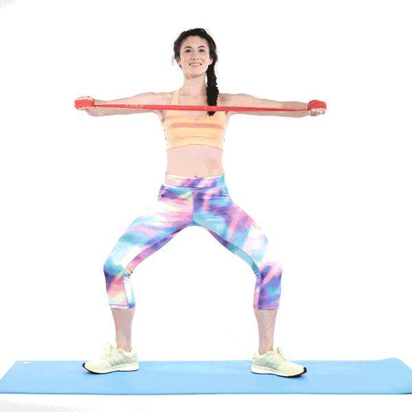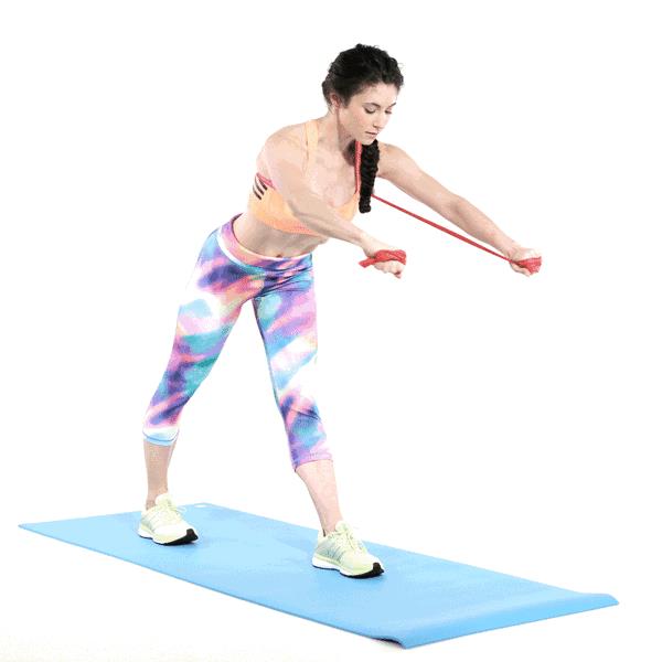 双脚踩住健身带,下半身保持屈膝,以核心肌群为发力点,双手前后摆动。