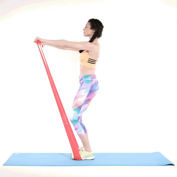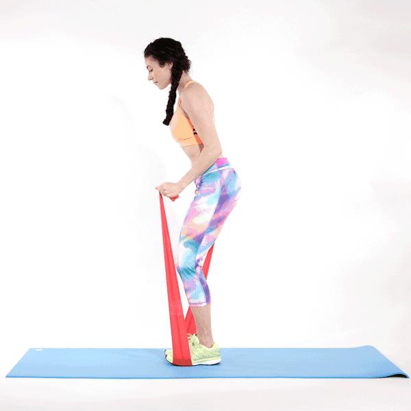 脚踩住健身带,下半身要保持住屈膝的姿势,双手前后摆动,摆动幅度不要过大,但要尽量向高拉起健身带。