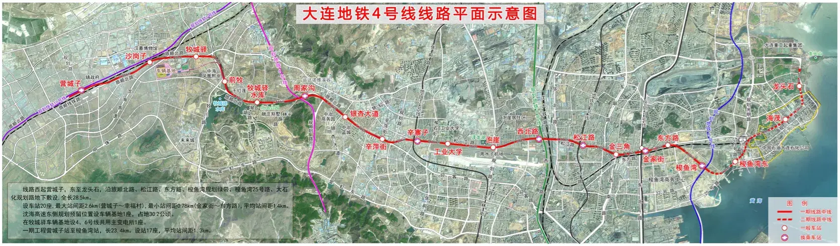 大连地铁4号线西起营城子,东至龙头石,沿营城子规划路、幸福村规划路、松江路、东方路、梭鱼湾规划绿带、梭鱼湾规划25号路、大石化规划路地下敷设。线路正线长27.62公里,全部为地下线。设站20座,最大站间距2.768公里(营城子站~幸福村站),最小站间距0.769公里(泽龙湖站~新达街站),平均站间距1.425公里。一期工程为营城子至梭鱼湾,线路长度23.008公里。二期工程梭鱼湾(不含)至龙头石,线路长度4.612公里。