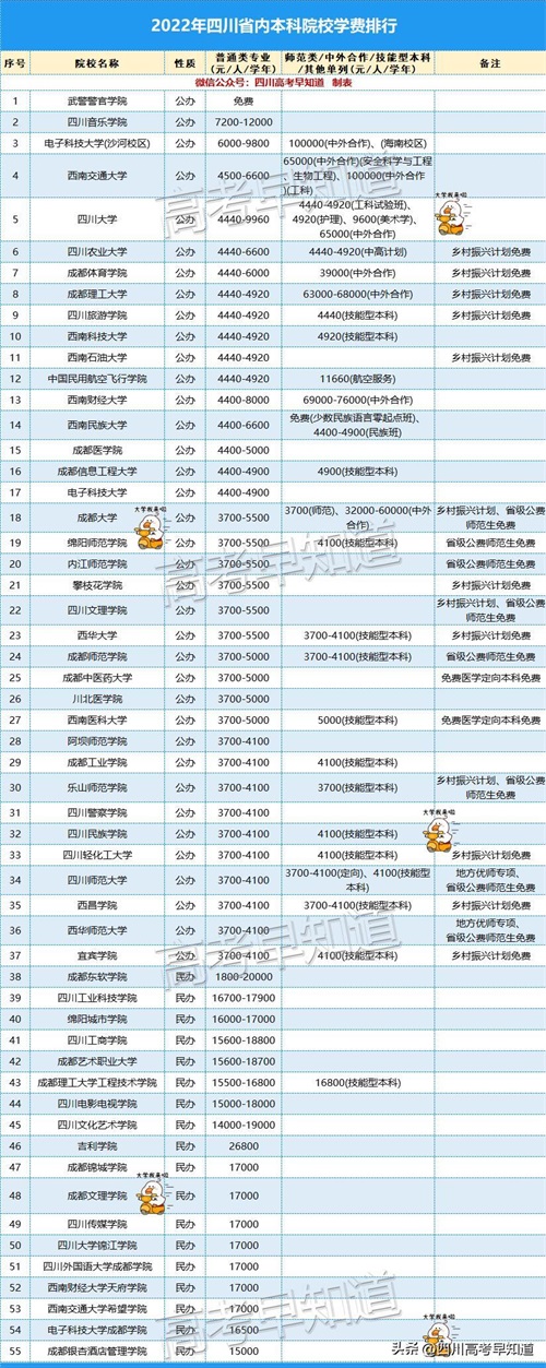 注:下表根据四川《招生考试报》统计,人工整理,若有错漏,以考试院公布的为准。下表根据普通类专业学费排序。