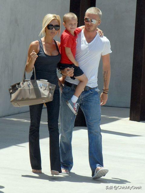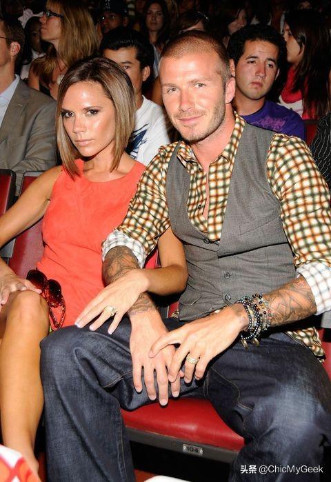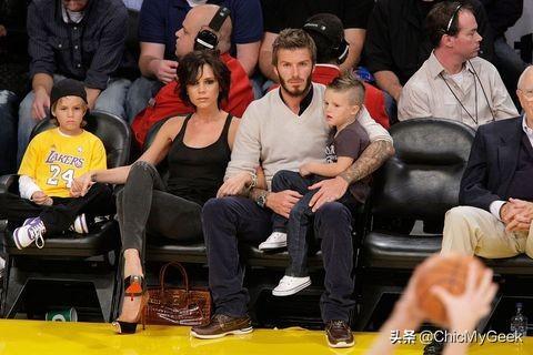 一头短发的贝嫂和贝克汉姆带两个儿子看球,贝嫂的黑色背心可以说是当时辣妹标记。