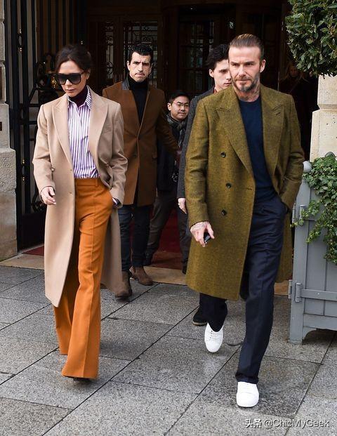 贝嫂身穿自己最爱的招牌颜色:丁香紫搭配夕阳橘红西装长裤,用黑色高领、焦糖色大衣玩出层次,而贝克汉姆尽管全身上下没有跟贝嫂一样的色彩,但贝克汉姆青苔绿大衣依然协调的跟贝嫂的大地色,搭配出城市游牧的情侣穿搭。