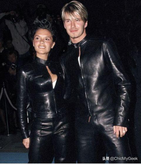 这套全身骑士感十足的皮衣与皮裤的搭配,在2000初可说是掀起一阵潮流!贝克汉姆也特地在庆祝22周年回顾这张照片,而维多利亚往上梳的短发和贝克汉姆刻意留的两撇小胡子,两人看起来就像是要去拯救世界的神仙眷侣!