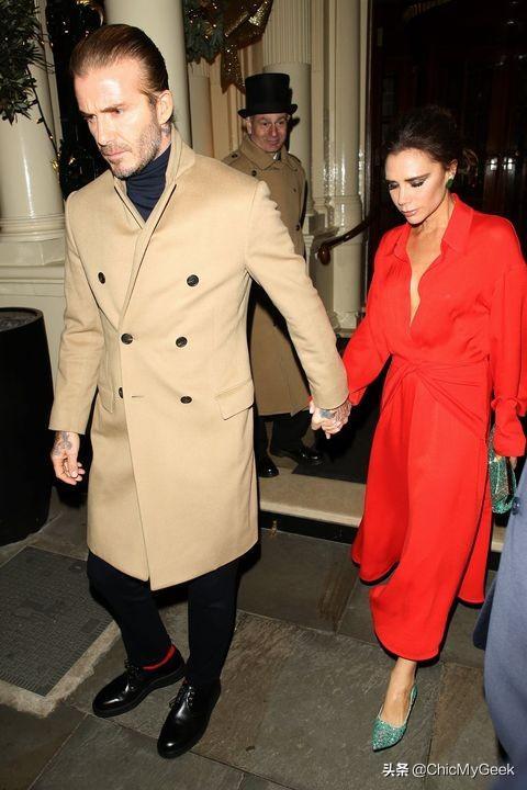 贝嫂穿上女人味十足的鲜红色洋装,搭配绿色亮片高跟鞋,我们偷偷发现穿着风衣的贝克汉姆、袜子也是红色的。