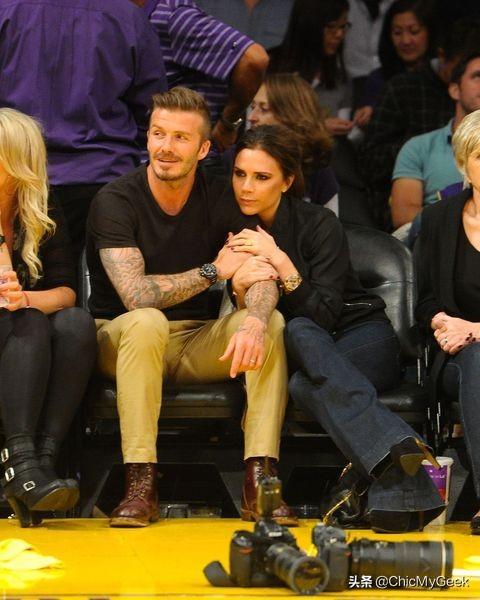 2012年贝克汉姆夫妇在洛杉矶看球,两人都穿黑色上衣,搭配不同颜色的下装,短靴跟工程靴,看起来还像是热恋的年轻情侣。