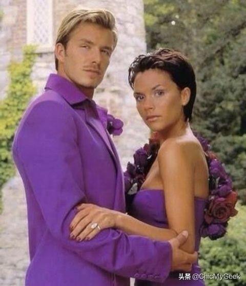 2021年贝克汉姆在Instagram上庆祝22年结婚周年庆祝,并写道:「22年后,还是要继续穿情侣装! 」看得出来两人感情有多甜蜜! 而这套两人1999年结婚时拍的婚纱大照,大胆运用了全身紫色却一点也不违和!维多利亚肩膀上的花圈设计更是让整套婚纱显得娇贵高雅。