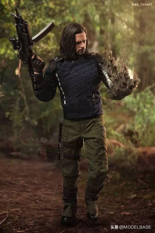 复仇者联盟三里面,冬兵巴基换上了瓦坎达提供的新手臂。在防御罩中和灭霸大军开战。并在片尾被响指打成了灰。Hottoys复联三的冬兵最近也爆出了最终样品图。和之前公布的预订图相比,新增了变灰过程中的特效件。
