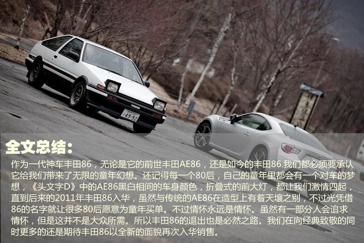 在2011年前夕,Corolla Levin和Sprinter Trueno两款车型采用了最后一代的后驱行驶。也是我们熟悉的丰田AE86最后的辉煌。也为这款后驱平台画上了圆满的句号。在2011年,丰田发布了FT86概念款车型,它的问世就是取代上一代丰田AE86的,并且在最后的1年多时间后,就被引入国内销售。也开启了全新丰田86时代。