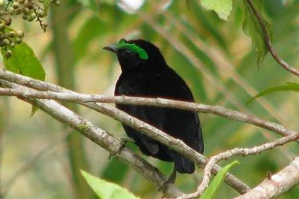 紫乌裸眉鸫是一种马达加斯加岛上的私有物种,它和其余裸眉鸫一般,都长有十分明显的眼周肉垂,不过紫乌裸眉鸫的肉垂浮现特殊的绿色。它的毛发简直全体都是乌色的,惟有肩膀的顶部长有一个迷你的三角形明黄色花纹,这也是它最明显的特性。