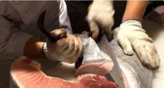 粉红的蓝鳍金枪鱼肉在接触空气后会迅速发生氧化反应,颜色逐渐变暗。所以解剖完毕,鱼肉要迅速处理成刺生。