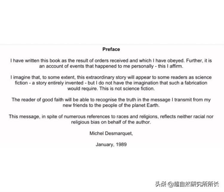 只见米歇尔先生在书的前言中这样写道:我是遵命写这本书的,我发誓这是发生在我身上的真实的事情,在一定程度上,这非同寻常的故事对有些读者来说更像是一本科幻小说,一个彻头彻尾编造的故事,但我并没有编造故事的想象力,这不是本科幻小说,正直善良的朋友会从中看出我从新朋友们那里带给地球人类的信息,