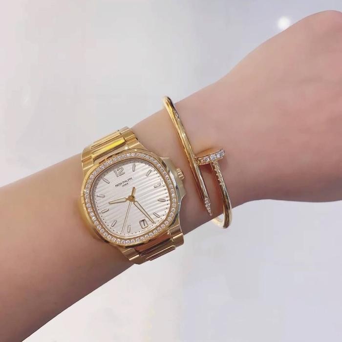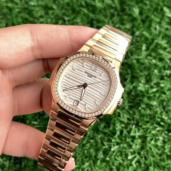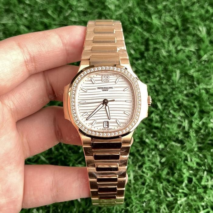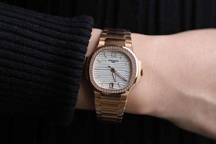 自古以来都说:男人爱手表,女人爱珠宝。如今在正规的社交场合,手表往往被视同首饰,一个有品位的女人应该也需要一款彰显自身气质的腕表来点缀。一款有金有钻的腕表,试问哪个女人能不爱呢!此款百达翡丽鹦鹉螺7118玫瑰金镶钻腕表,将优雅休闲的经典美丽完美展现。银白色表盘上装饰水纹波浪,搭配玫瑰金表链和表圈镶嵌钻石,奢华高贵。完美演绎职场女性的时尚品味,在优雅之余又不失强悍霸气。