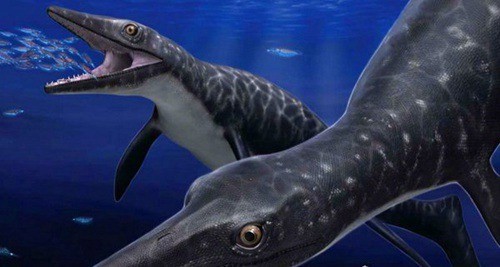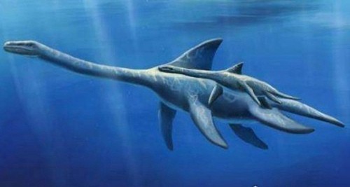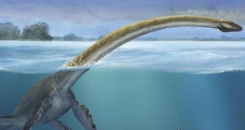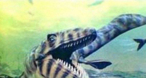 蛇颈龙居于水中十大恐龙首位,它生存于早白垩世上,分布于东半球,又名尼斯湖水怪,长达11~15米,仅头骨即占去约3.7米。外形像一条蛇穿过一个乌龟壳:头小,颈长,躯干像乌龟,尾巴短,头虽然偏小,但口很大,口内长有很多细长的锥形牙齿,捕鱼为生,四肢为适于划水的肉质鳍脚,能在水中往来自如,又能爬上岸来休息或产卵繁殖后代。它在海洋中主要以鱼、鱿鱼和蛤蜊、螃蟹等其他海底贝类,它也是海洋中的霸主之一。