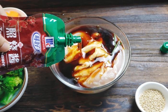 步骤3、在鸡腿排的碗中继续加入适量的照烧汁腌制30分钟,充分入味。