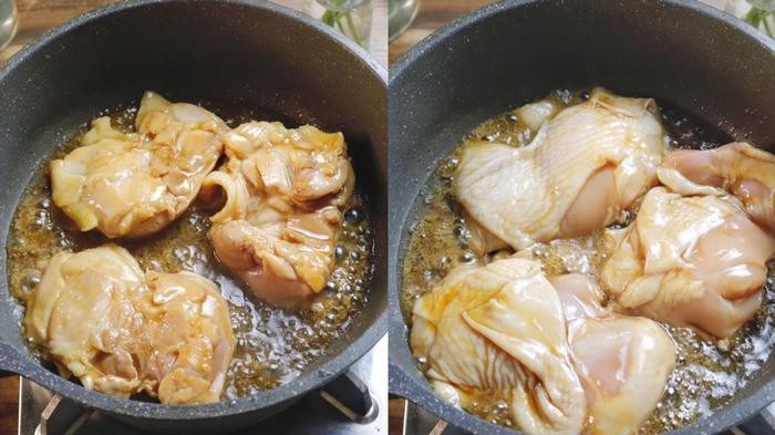 步骤5、油热后,放入腌制好的鸡腿排,直到将鸡腿排的两面煎至两面金黄,随后倒入腌制时的照烧汁进行入味、收汁。