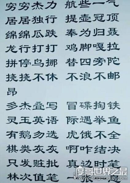 看到上面图片中的文字了吗?这就是陈柯宇歌曲《生僻字》中的汉字,如果没有标上音标的话,你能认识几个?第一个字我想就会难倒一大批人,“茕茕”、“龘龘”这都是些什么鬼?连字都不认识何谈唱出来了,这首歌也是被网友调侃为中国最难唱也最难学的中文歌,你会唱了吗?