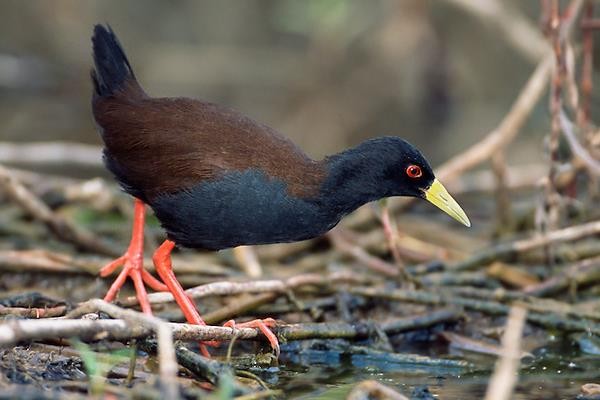 马岛苦恶鸟是一种全身漆黑的水鸟,瞳孔也是一样的黑色,这使得远看几乎看不出眼睛在哪儿,全身唯一鲜艳的部位就是嘴壳和双腿,双腿是非常鲜艳的红色,而嘴壳则呈现明黄色,它和新几内亚秧鸡完全不同,身上没有大多数秧鸡那样的斑点,即便是腹部的羽毛也没有泛白。