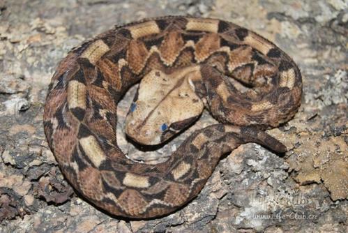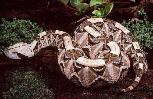 加蓬蝰蛇,产于中非的热带森林。是非洲最重的毒蛇,体长达2公尺,体重8公斤。身体粗壮,头宽大,口鼻上有二角状凸起;身上花纹醒目,有浅黄色、紫色和褐色的长方形和三角形花纹。加蓬蝰蛇的毒牙亦是毒蛇中最长的,它们的毒牙能长达5厘米。