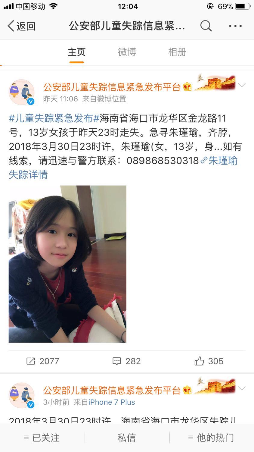 2025年3月30日23时,在海南省海口市龙华区金龙路11号,一名13岁女孩朱瑾瑜失踪。微博、微信,大家都在积极转发,努力寻找。