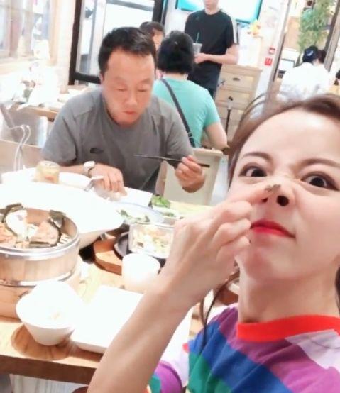 莉哥扮猪的时候,这是她和爸爸出来吃饭的时候拍的,用食指按住鼻子整出来的找哥哥造型,又丑又可爱。