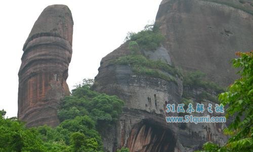 阳元石:位于广东省仁化县丹霞山景色区,锦江之西、玉女峰旁,高28米,直径7米,酷似男性勃起的生殖器,孤峰顶立,仰天矗立,直傲天穹,似要向玉女宣示阴jing的雄伟。