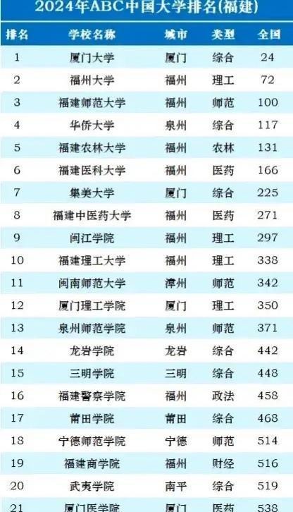 福建省20强大学排名:集美大学第7,三明学院第15,武夷学院最后
