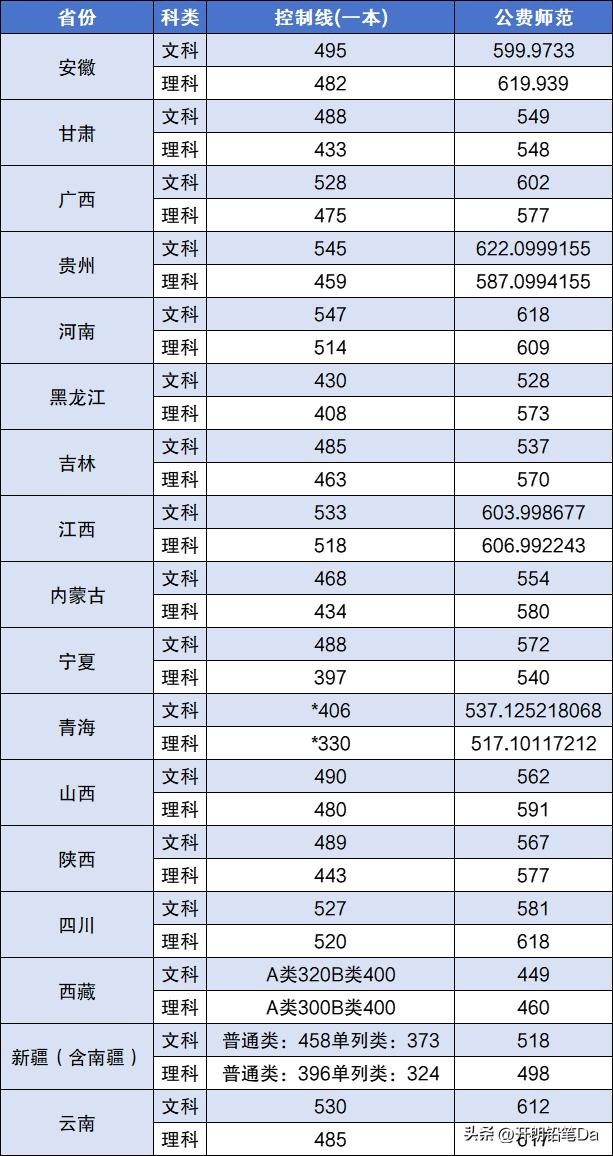 从目前已经公布的数据来看,北师大公费师范生在全国录取线平均610分左右,在安徽、湖南以及四川等地录取线会相对偏高,可达到650分左右,不过目前学校官网还没有公布录取数据,下面是老师根据各省考试院公布的数据为大家整理的最低分汇总,可先参考。