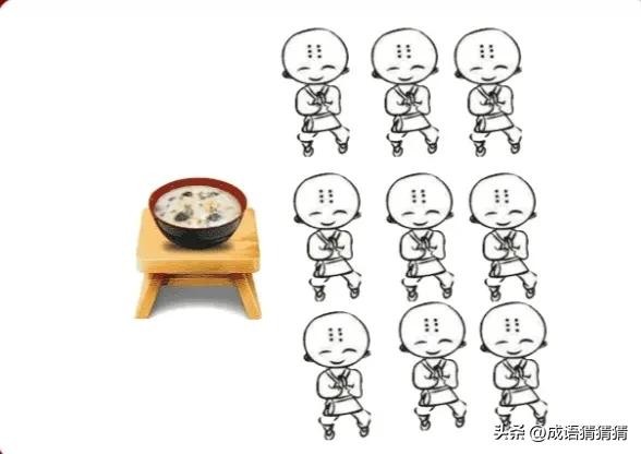 成语释义:和尚多,而供和尚喝的粥少。比喻物少人多,不够分配。