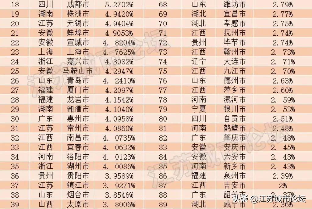 意外的是,安徽有三座城市位居排行榜前20名,更意外的是矮子里面的高子合肥竟然排在全排行榜的第2名。而去年刚夺得长三角GDP增速最快的芜湖也排到了全国第4名的芜湖。不起眼的铜陵竟然也排到了17名。