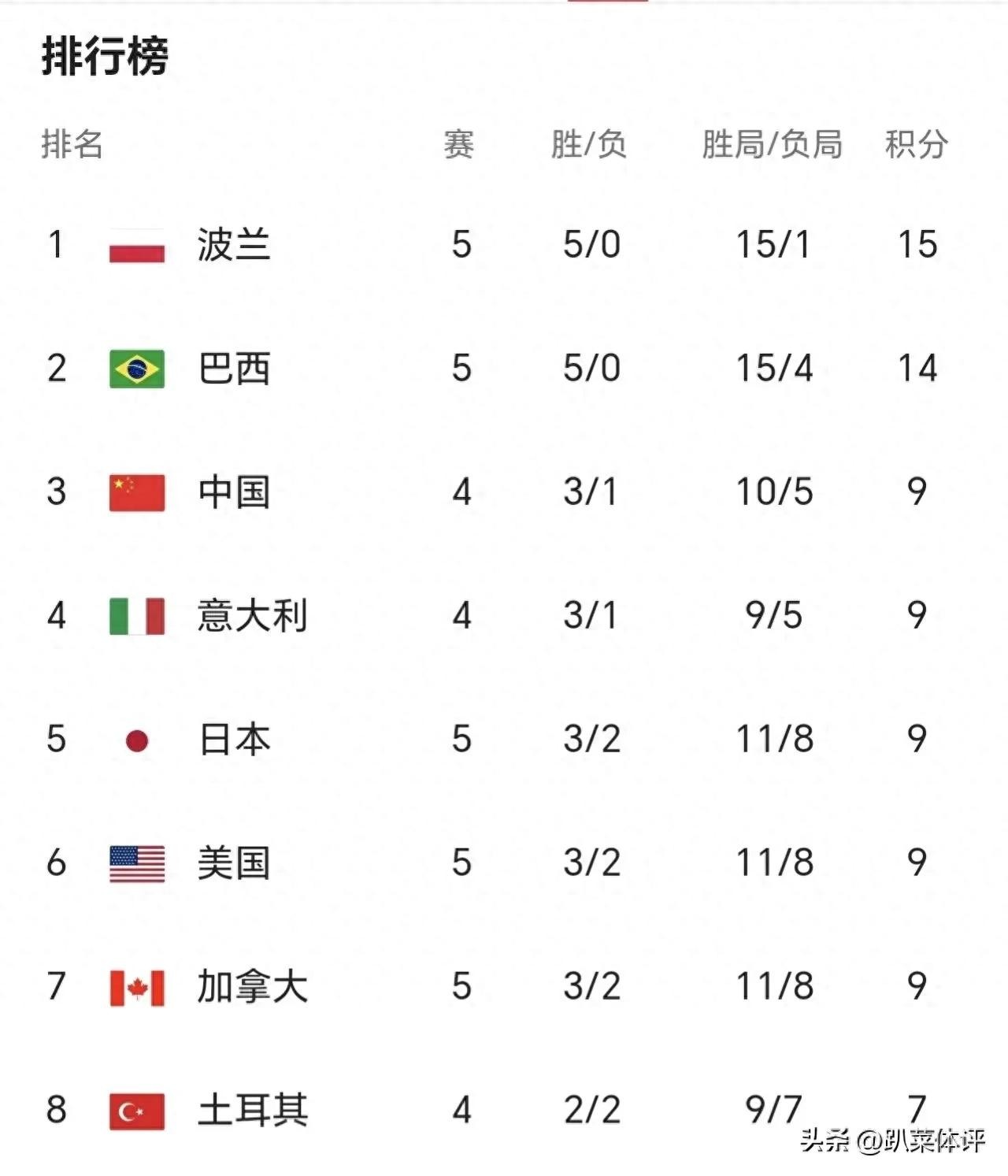 中国女排目前在少赛一轮的情况下,3胜1负积9分因胜负局优势力压意大利、日本、美国、加拿大排名积分榜第3位。