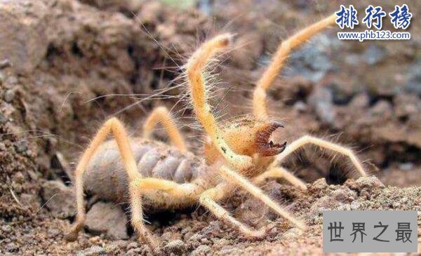 常我们见到蜘蛛的不过几厘米,而一些可以饲养的蜘蛛,体型则会达到手掌大小。而世界上最大的食人蛛,骆驼蜘蛛则长达25厘米,其奔跑速度为每小时16千米,而且骆驼蜘蛛可以吞下自身3倍体重的物体。而另其名声大噪的原因就是因为传言它能杀死人类,并且吃掉尸体。下面排行榜123()就为大家带来世界上最大的食人蛛。