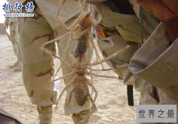 美军在伊拉克战争时,发现了骆驼蜘蛛中的“巨无霸”,巨骆驼蜘蛛。这种巨型骆驼蜘蛛大小可达30-40厘米。美军士兵为其拍摄了照片,并在在伊拉克战争结束后将其带回美国,使人们知道世界上还有这样一种奇特的动物存在。