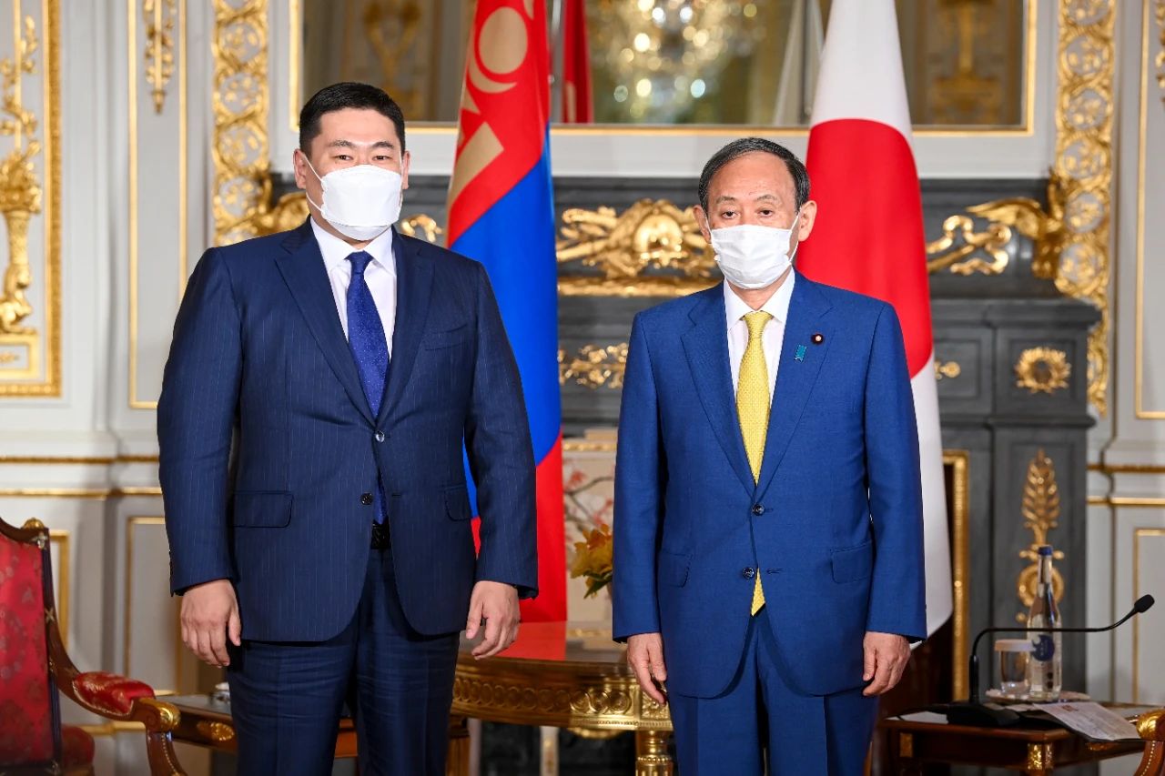 7月22日下午,菅义伟和奥云额尔登举行会谈。/IC photo