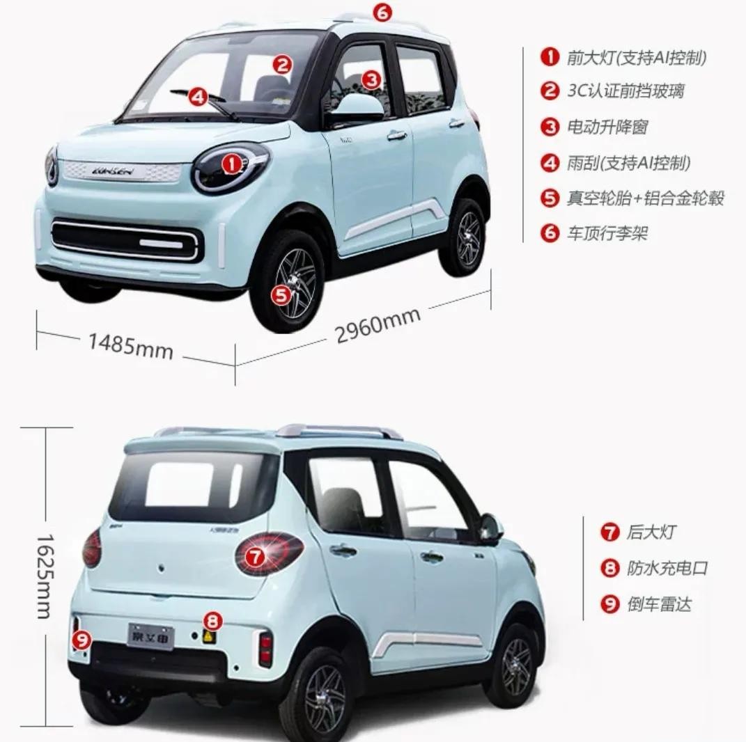 在其他方面,我们可以看得出,这款电动车的车身尺寸范围,长、宽、高依次为2960MM、1485MM、1625MM,是新能源电动汽车的标准尺寸,像这样的车辆属于机动车,驾驶人员需要持有驾驶证c1或者c2。