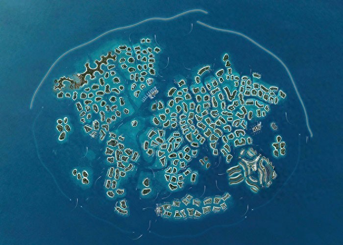 拍摄的空中俯瞰图,展示了坐落于迪拜沿岸的世界群岛,看上去还是与真正的世界地图存在很大差异。造成世界岛烂尾的原因还远不止资金这一个问题,整个世界岛似乎整体都在向中心靠拢并不断下沉,岛屿下沉这一危险也让很多潜在购买者打消了购买的念头。