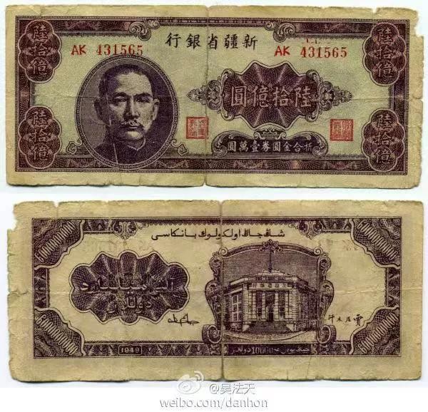 另外有一张的面额大得吓人,不过,不是中华人民共和国出的纸币,是1949年新疆省(当时新疆为省,不是自治区)出牌发行的,面额为60万元!