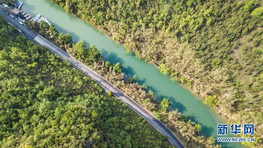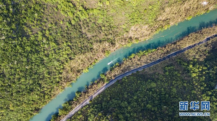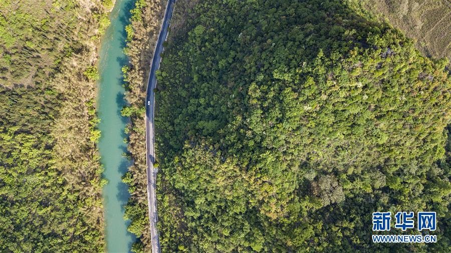 汽车行驶在格凸河景区(4月19日无人机拍摄)。谷雨将至,贵州省安顺市紫云苗族布依族自治县格凸河景区山青水秀,风光秀美。新华社记者陶亮摄