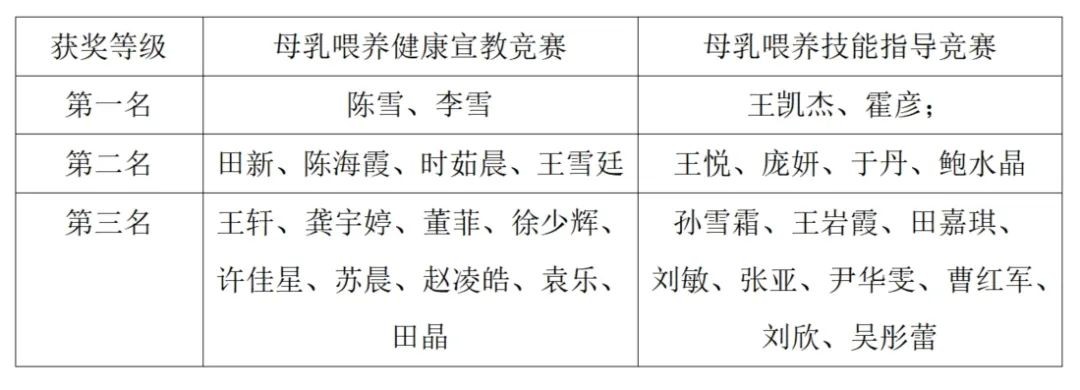 母乳喂养健康教育授课比赛,由齐歆副主任、宋丽莉副主任、各科科护士长、围产医学部护士长担任评委,母乳喂养操作技能由卢㛃副主任、李立梅老师和围产医学部护士长担任评委。围产医学部各病区选拔出的30名的护士参加比赛。