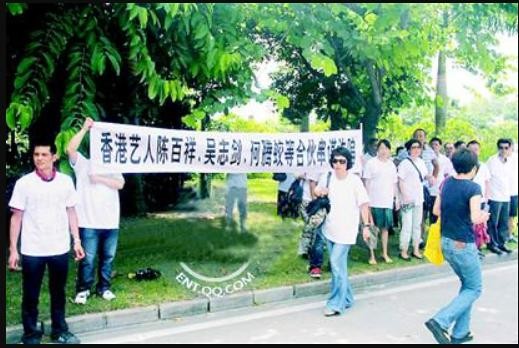 一大批受害人,身穿写着“惩罚骗子”字样的白色T恤,举着“香港艺人陈百祥诈骗”的白色横幅,在侦查局门口高喊——