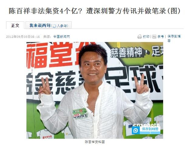 9月4日,有媒体报道,陈百祥被深圳市公安局经济犯罪侦查局,以涉嫌非法集资4亿元而传讯。