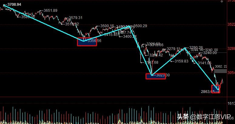 那么有了深蹲的词汇,本人不但定义了3290的结构,更直接定义了3708的下跌五浪结构,包括三个红色方框的位置。