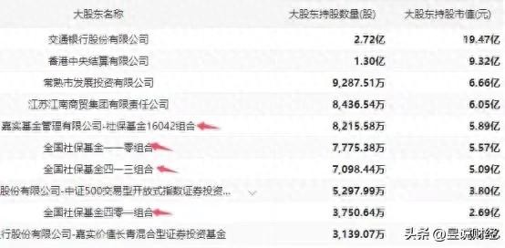常熟银行被4只社保基金抱团,分别是:社保基金16042组合持有8215万股,社保基金110组合持有7775万股,社保基金413组合持有7098万股,社保基金401组合持有3750万股。