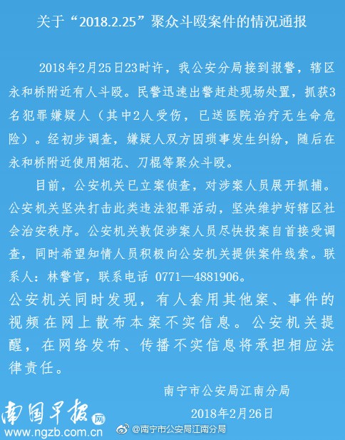 最新!南宁永和大桥几十人聚众斗殴!警方发布通报,已抓获3人