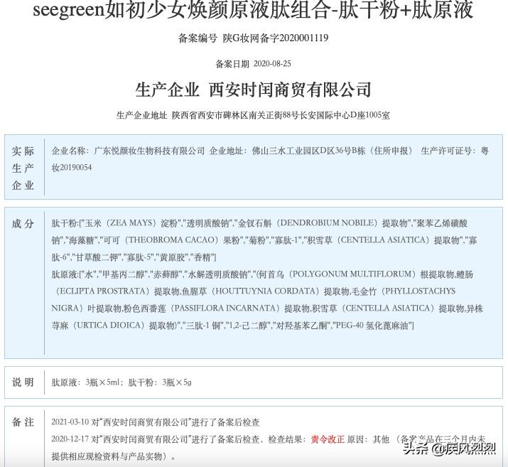 直销360网在国家食药监局网站官网中查询到:seegreen如初少女焕颜原液肽组合-肽干粉+肽原液与seegreen如初少女颜原液肽组合-肽干粉+肽原液的备案信息,这两个备案信息产品实际生产同为一个公司即广东悦颜妆生物科技有限公司,而且生产许可证号为同一个号:粤妆20190054,成分和说明都是一样,实际为同一厂家生产的同一个产品,只不过生产企业广州有绿生物科技有限公司已经注销,实际的运营公司为西安闰商贸有限公司;并不是代理商所说“seegreen如初少女颜原液肽组合”是由香港时闰集团自己生产研发,则是由广东悦颜生物科技有限公司生产的产品。