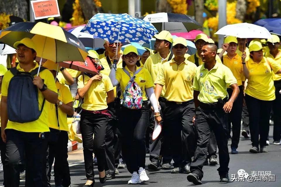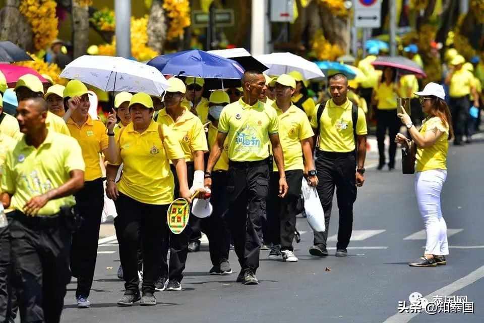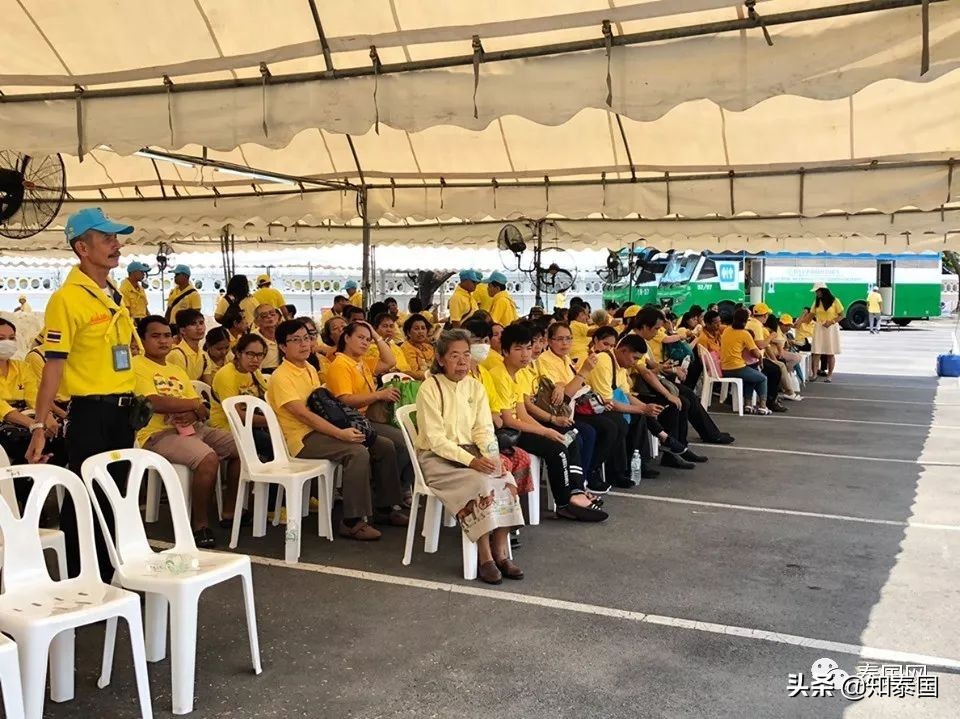 当地时间5月5日12:00,曼谷特西林塔瓦寺附近休息区,志愿者向民众提供食物及饮用水,并为等候乘车前往国王加冕典礼巡游活动的民众发放黄色帽子。初步统计,今天已有6000多人乘车前往。