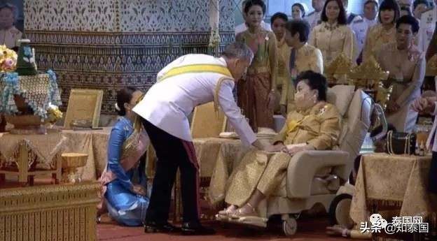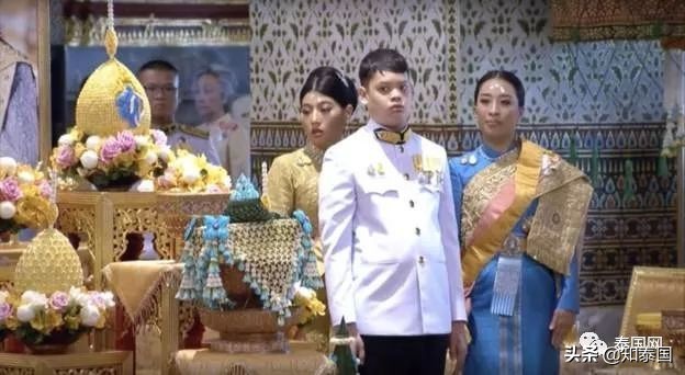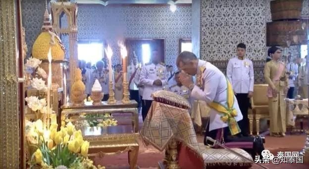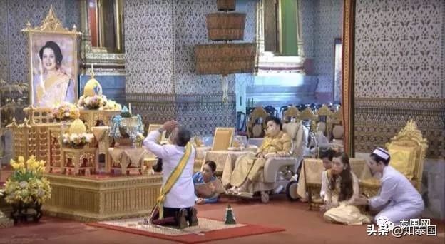 上午王室册封仪式,十世王跪拜母妃诗丽吉画像,以新国王身份接受诗琳通公主、朱拉蓬公主朝拜,诗琳通公主、朱拉蓬公主受封。