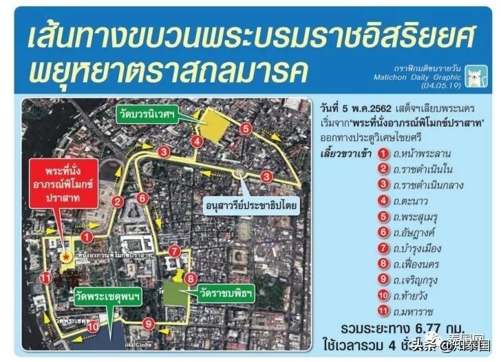 泰国新泰日报社讯 泰媒报道,5月5日当地时间16.30十世王将遵传统进行巡游,届时国王将从Aporn Pimok殿移驾波稳尼威寺、拉查波比托寺和卧佛寺,接受路边民众朝拜,具体路线如图示: