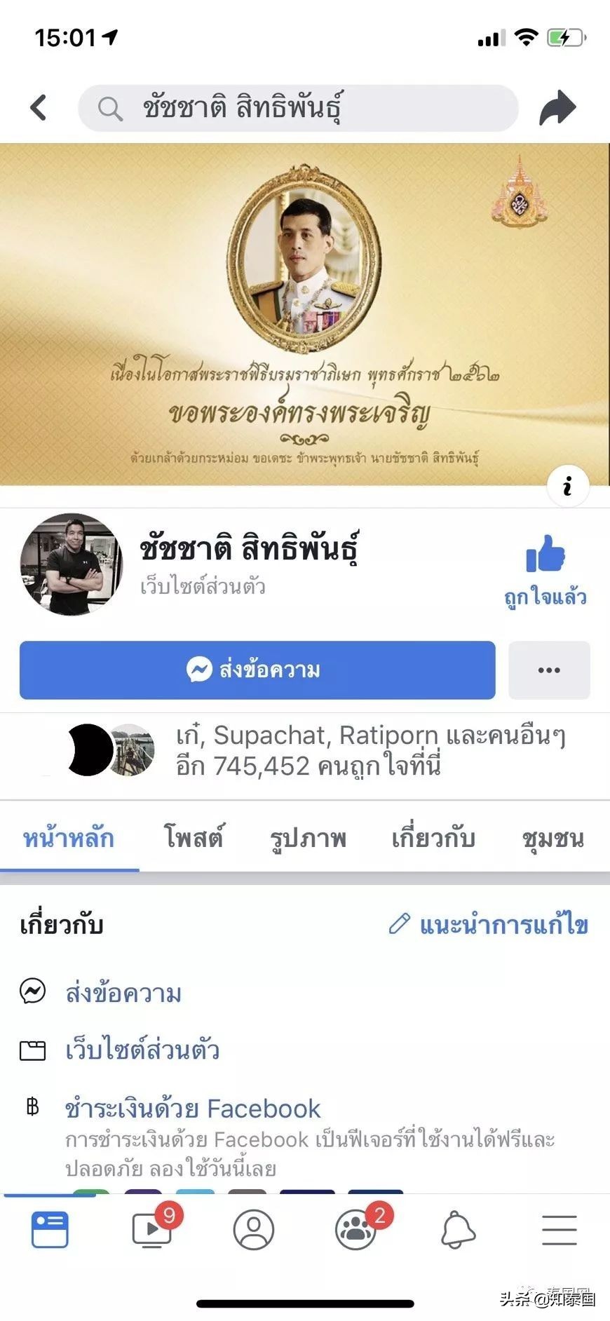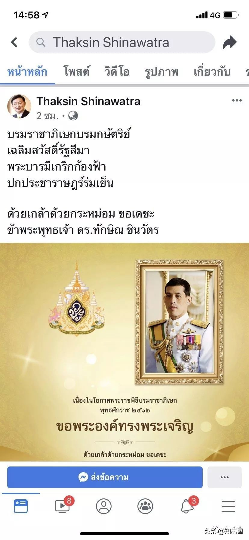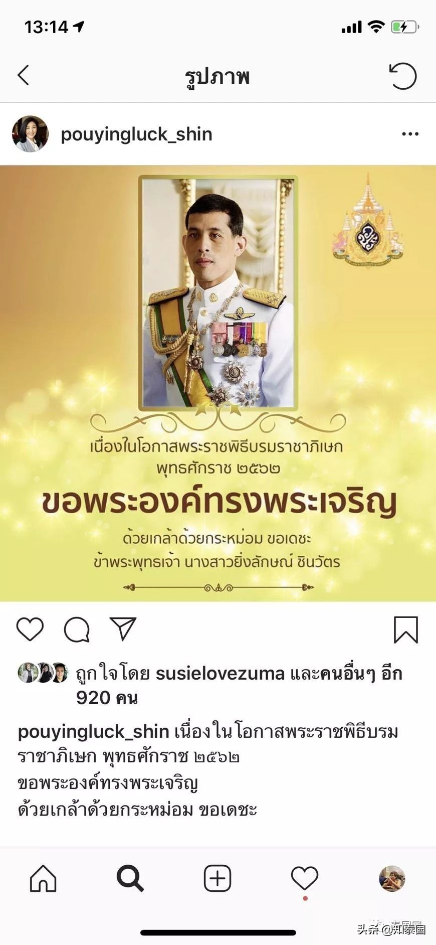 泰国新泰日报社讯 泰媒报道,5月4日泰国十世王加冕典礼正式举行,以泰国前总理他信、英拉,党魁素妲叻、察查等为首的为泰党政客纷纷通过个人社交账户发文祝贺国王加冕。
